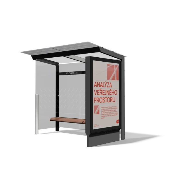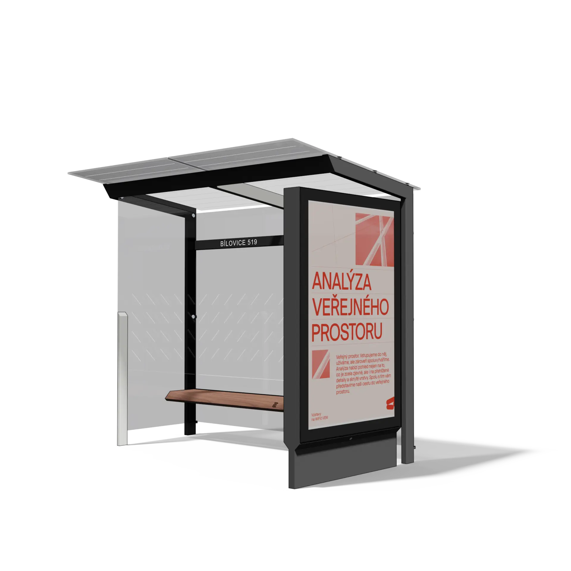 - Materijal: Nosiva čelična konstrukcija s antikorozivnim cinčanim premazom i praškastim premazom, stražnja i bočna stijenka od sigurnosnog stakla s tiskom, integrirana klupa, sjedalo od masivnih drvenih letvica, info ploča