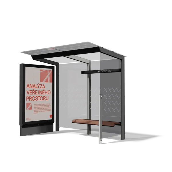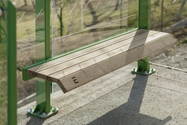 • Materijal: Nosiva čelična konstrukcija s antikorozivnim cinčanim premazom i praškastim premazom, stražnja i bočna stijenka od sigurnosnog stakla s tiskom, integrirana klupa, sjedalo od masivnih drvenih letvica, info ploča