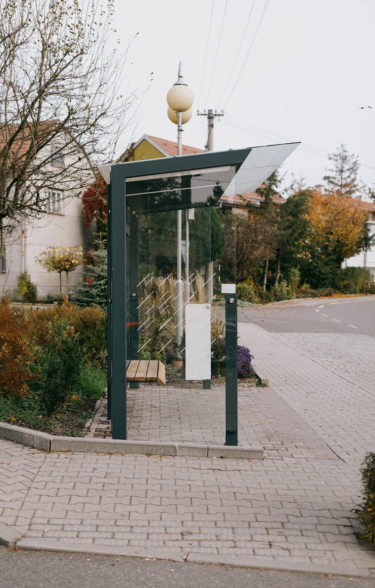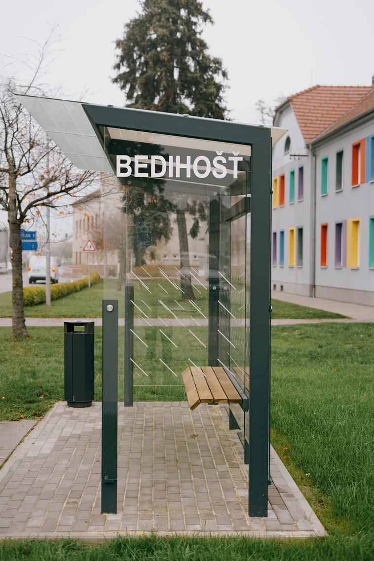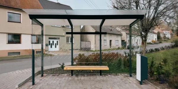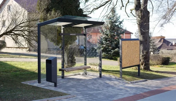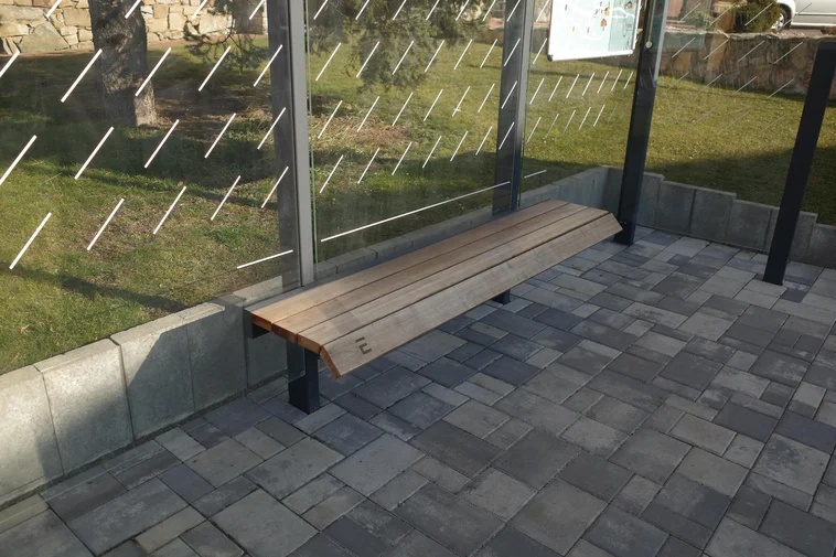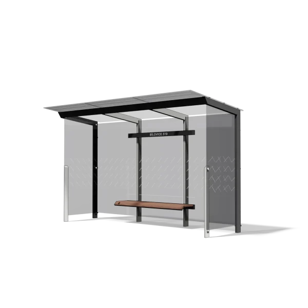- Materijal: Nosiva čelična konstrukcija s antikorozivnim cinčanim premazom i praškastim premazom, stražnja i obje bočne stijenke od sigurnosnog stakla s tiskom, integrirana klupa, sjedalo od masivnih drvenih letvica