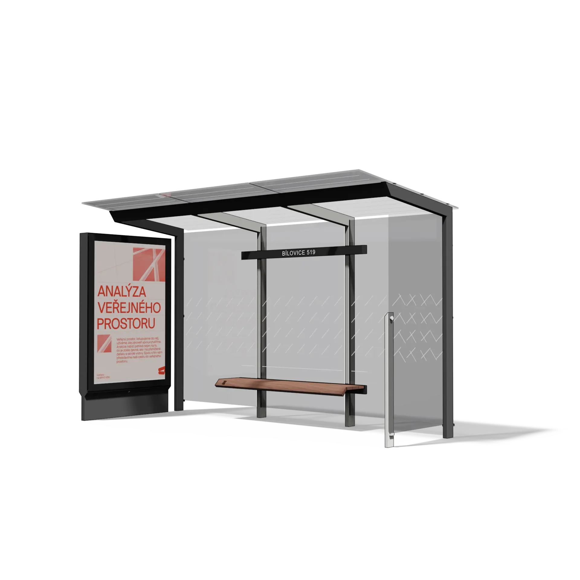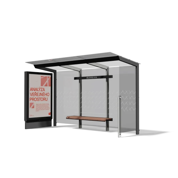 - Materijal: Nosiva čelična konstrukcija s antikorozivnim cinčanim premazom i praškastim premazom, stražnja i obje bočne stijenke od sigurnosnog stakla s tiskom, integrirana klupa, sjedalo od masivnih drvenih letvica, info panel