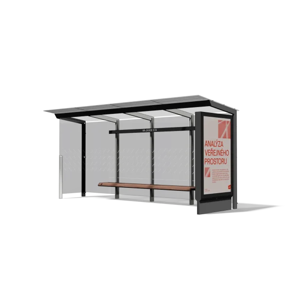 - Materijal: Nosiva čelična konstrukcija s antikorozivnim cinčanim premazom i praškastim premazom, stražnja i obje bočne stijenke od sigurnosnog stakla s tiskom, integrirana klupa, sjedalo od masivnih drvenih letvica, info panel