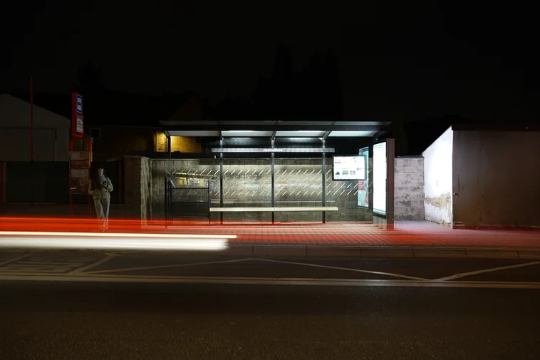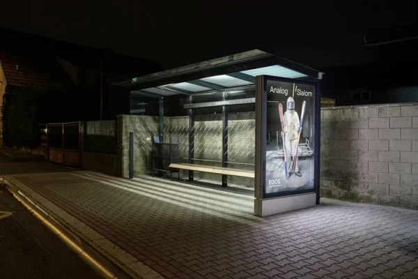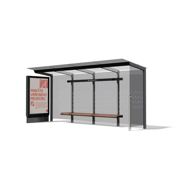 - Materijal: Nosiva čelična konstrukcija s antikorozivnim cinčanim premazom i praškastim premazom, stražnja i obje bočne stijenke od sigurnosnog stakla s tiskom, integrirana klupa, sjedalo od masivnih drvenih letvica, info panel