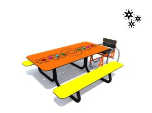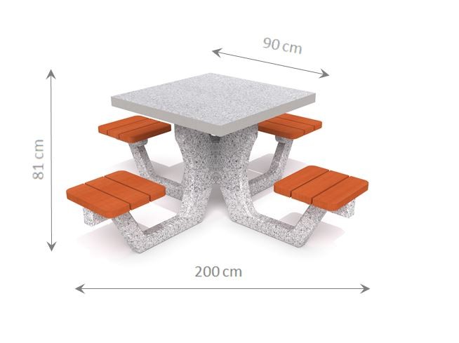 Betonski stol za piknik s 4 sjedala. Ploča stola (debljine 6 cm) izrađena od poliranog betona s ugrađenim gres pločicama. Rub ploče izrađen od aluminija. Na vrhu se nalazi ploča za igru ​​ludo. Sjedala izrađena od smrekovog drva debljine 4 cm, dva puta lakirana u odabranoj boji.