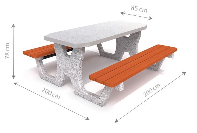 Betonski stol za piknik s 2 klupe. Ploča stola (debljine 6 cm) izrađena od poliranog betona s ugrađenim gres pločicama. Rub ploče izrađen od aluminija. Na vrhu se nalazi ploča za šah/damu i ploča za ludo igru. Sjedala izrađena od smrekovog drva, debljine 4 cm, dva puta lakirana u odabranoj boji.