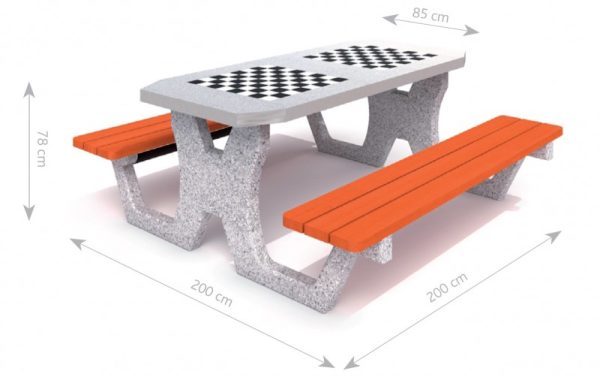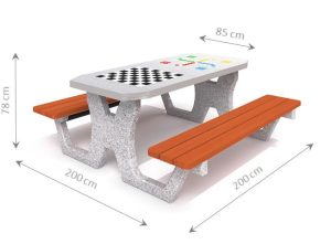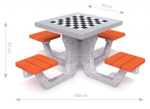 Betonski stol za igre Šah/Dame ne ljuti se sa 4 mjesta. Ploča stola (debljina 6 cm) od poliranog betona sa ugrađenim gres pločama. Rub gornje strane izrađen od aluminija. Na vrhu se nalazi ploča za igre Šah/Dame. Sjedalice izrađene od drva smreke debljine 4 cm, dva puta lakirane lakom na odabranu boju.