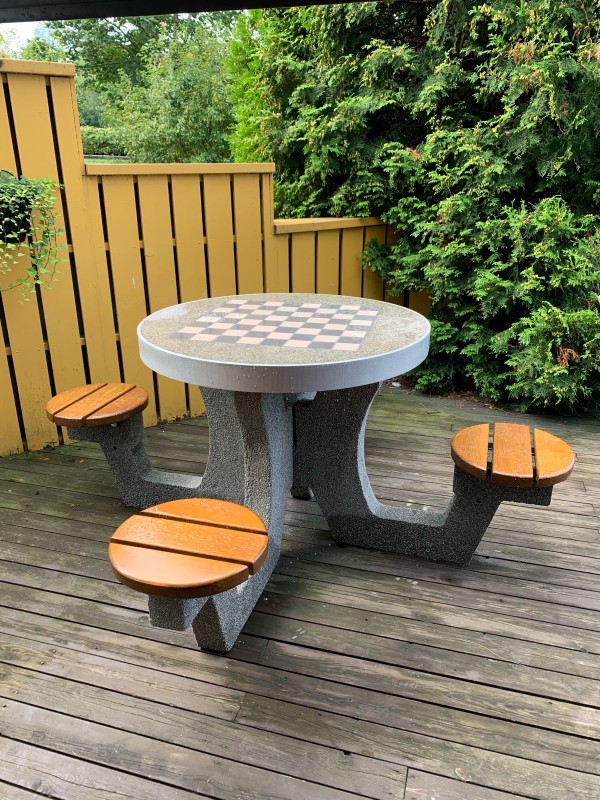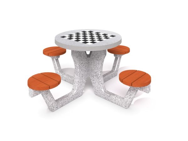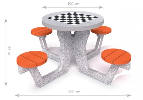 Betonski stol za igre Šah-Dame sa 4 stolice klupe. Ploča stola (debljina 6 cm) od poliranog betona sa ugrađenim gres pločama. Rub gornje strane izrađen od aluminija. Na vrhu se nalazi ploča za igre Šah-Dame. Sjedalice izrađene od drva smreke debljine 4 cm, dva puta lakirane lakom na odabranu boju.