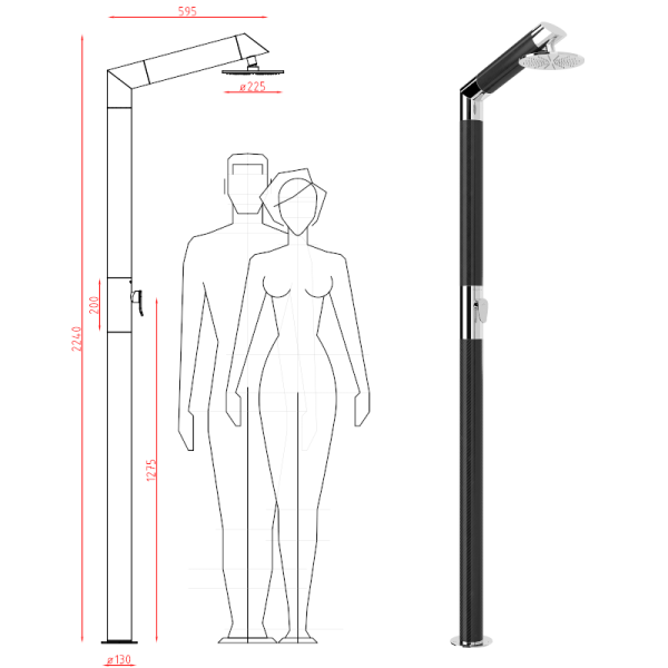 Promjer glavnog tijela 90 mm, visina 225 cm, visina tuša 210 cm
