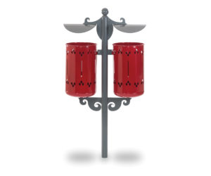 Sastoji se od jednog nosećeg čeličnog okruglog stupa Ø 60 mm i visine 135 cm za sustav sidrenja u tlu. Opremljena je s dva krovna krova izrađena od prešanog čeličnog lima debljine 6 mm, koji su povezani s kantom preko ornamentalnih oblikovanih motiva debljine 6 mm. Ukrasni stup od lijevanog željeza. Dva ukrasna modula debljine 6 mm na donjem dijelu spremnika, dajući im dodatnu potporu. Kante cilindričnog oblika od lakiranog galvaniziranog čeličnog lima s geometrijskim motivima. Sustav za pražnjenje otkvačivanjem i naginjanjem uz pomoć imbus ključa, isporučen. Potpuno pocinčan. Plastificiranje na 180°C.