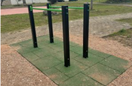Stanica se može uskladiti s art.2137 aluminijskom Dibond® pločom 62×33 cm (opcija), debljine 3 mm, koja pokazuje kako pravilno izvoditi vježbu i broj ponavljanja. Panel je oslonjen na stup izrađen od lijepljene lamelirane borove daske tretirane netoksičnim solima, presjeka 7×7 cm i visine 250 cm, za sustav sidrenja u tlu. Montažni sustav s vijcima od pocinčanog čelika 8,8 i samosigurnim maticama. Obojene najlonske matice s kapicom prema zakonu. Ukupne dimenzije: 300 x 209 x 30h cm.