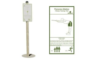 Izrađen od laminiranog drva nordijskog bora impregniranog u autoklavu s netoksičnim solima. Sastoji se od 4 stupića sekcije. 9 x 9 cm, sklopljene s 2 horizontalne šipke izrađene od vruće pocinčane čelične okrugle cijevi presjeka Ø 4 cm. Stanica je opremljena znakom (po izboru) art. 2139 cm 62×33 u aluminij Dibond® debljini. 3 mm na kojem je sito preslikana vježba s opisom i brojem ponavljanja; znak je poduprt lameliranim drvenim stupom sekcije. 7 x 7 cm i visine 250 cm za ukopavanje. Sastavljanje pomoću vijaka od pocinčanog čelika 8,8 i samosigurnosnih matica. Elementi poklopca matice od najlona u boji. Kape od polietilena.