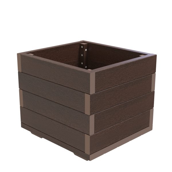Žardinjera iz Flora linije, izrađena u cijelosti od letvica od 100% recikliranog materijala (50% reciklirane plastike i 50% biomase – rižine ljuske), ne zahtijeva održavanje s vijcima od nehrđajućeg čelika, dimenzija: 600x550x510 mm.
