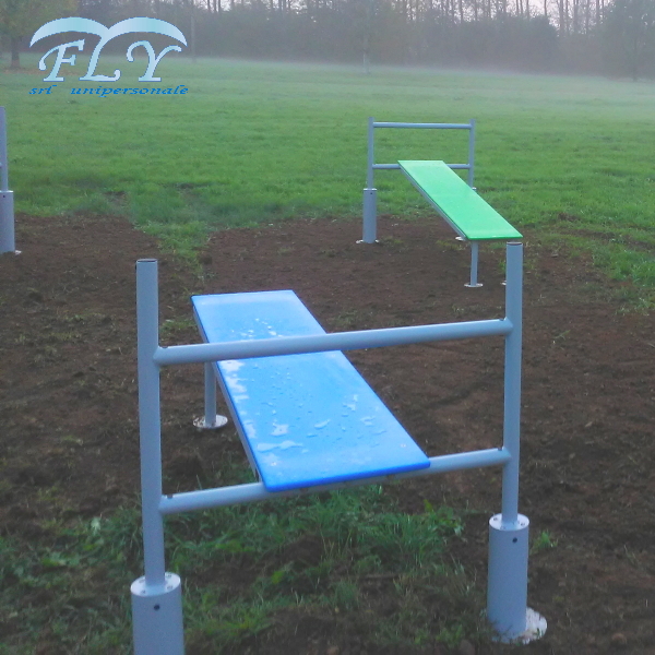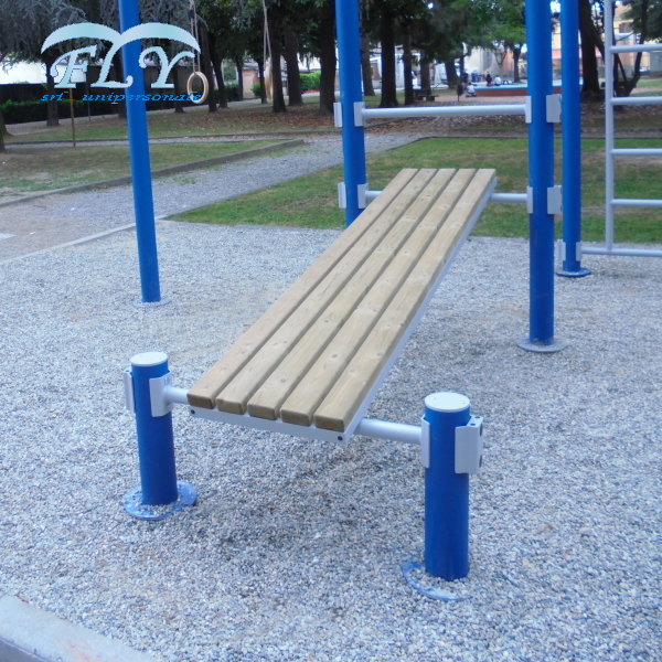 Vanjski fitness GHF004 – nagnuta klupa. Okvir je izrađen od pocinčanih i obojenih čeličnih cijevi. Potporna površina je izrađena od polietilena. Kompletna s ukrasnim osnovnim pločama i produženim nosačem za usidrenje betonskim sidrom. Alat za jačanje trbušnih mišića.