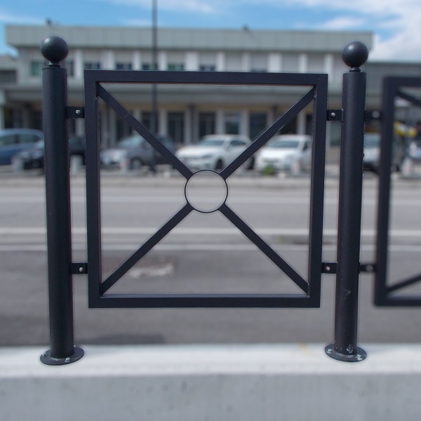 Modularna barijera Barcellona 100 cm i 200 cm dodatni modul – pričvrstiti vijcima (jedan nosač + ploča). Pregrada izrađena od čeličnog cjevastog nosača s gornjim klinom i kuglom od kovanog čelika. Oplate spojene na nosač čeličnim vijcima, izrađene od obodnog okvira u četvrtastom cjevastom i ravnom križu, sa središnjim čvorom koji se sastoji od okruglog prstena. Pregrada se isporučuje s pločom i nosačem koji se kontinuirano pričvršćuje na osnovni modul. Svi metalni dijelovi su pocinčani prema UNI standardima i bojani termoreaktivnim poliesterskim prahom prema raznim RAL nijansama. Za pričvršćivanje vijcima, isporučuje se s bazama opremljenim s 4 rupe za ekspanzijske vijke za pričvršćivanje na tlo. Koristi se za zaštitu nogostupa u blizini raskrižja ili za biciklističke staze.