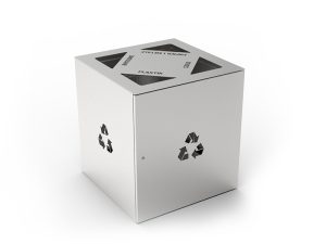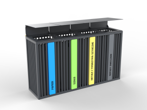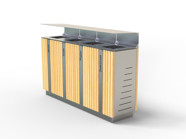 KS.21.01.02 kanta za razvrstavanje otpada s krovom od čelika i drvenih letvica. Košara je dostupna od poliranog nehrđajućeg čelika ili čelika obloženog prahom. U drugom slučaju na raspolaganju imamo osnovnu RAL paletu pomoću koje ćemo boju košare uskladiti s investicijom ili okolinom.