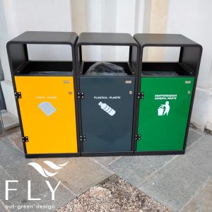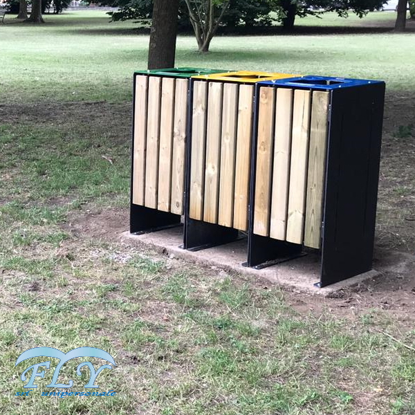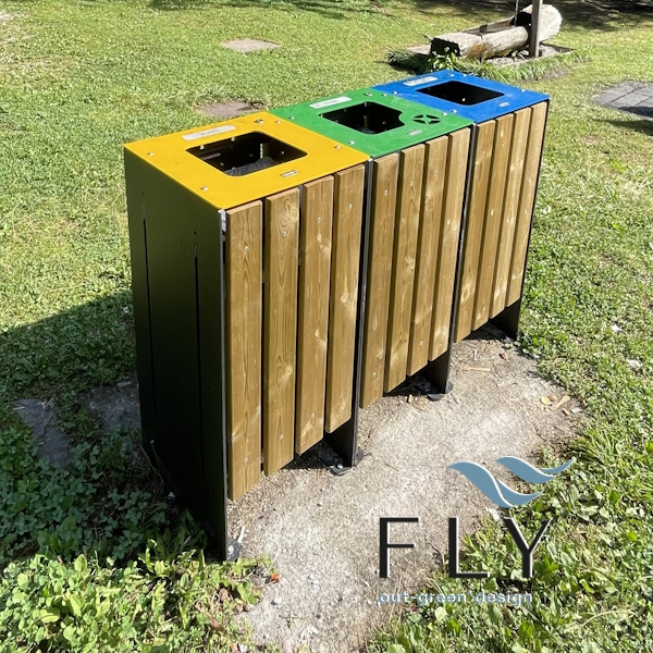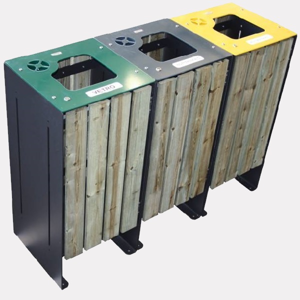 3-sektorska posuda za razvrstavanje otpada s pocinčanom i lakiranom čeličnom konstrukcijom, obložena drvenim letvicama.