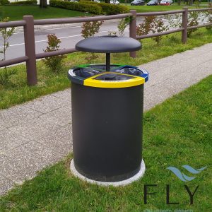 Kanta za razvrstavanje otpada sa 3 spremnika, kompletna sa poklopcima sa ili bez pepeljare. Nosač koji se pričvršćuje vijcima ili ugrađuje. Izrađena od pocinčanog i lakiranog čelika.