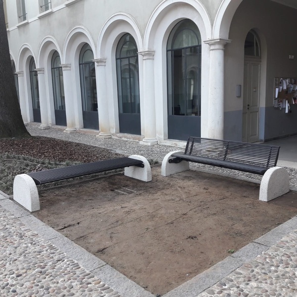 Klupa sa sjedalom od pocinčanog čelika obojanog termoreaktivnim poliesterskim prahom u raznim RAL bojama. Zaobljene strane su od mramornog granulata. Sjedalo se sastoji od vučenih cjevastih elemenata, zavarenih na tri oblikovana limena nosača laserskom tehnologijom i zauzvrat zavarenih na središnju horizontalnu cjevastu prečku. Dvije prirubnice za zatvaranje izrezane laserskom tehnologijom pričvršćene su na bočne krajeve sjedala. Dvije odgovarajuće izbušene čelične prirubnice zavarene su na dva kraja središnje prečke koja podupire sjedalo, s funkcijom sidrenja klupe na bočne oslonce pomoću vijaka, opremljenih ugrađenim navojnim čahurama.