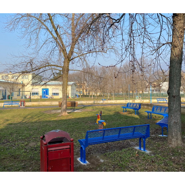 Čelična klupa sastavljena od stranica u čeličnim cijevima ovalnog oblika, u obliku obrnutog slova U, na koje su potporni profili sjedala i prirubnice ovalnog oblika zavareni za pričvršćivanje na tlo. Stranice i rubovi su laserski oblikovani.