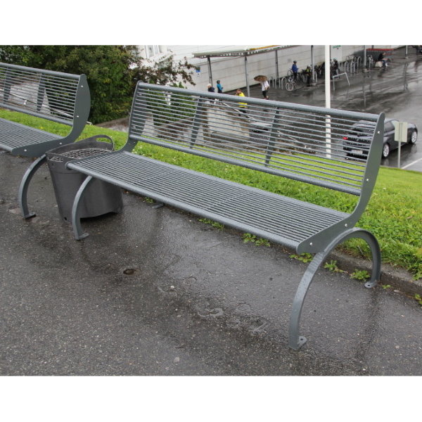 Metalna klupa sastavljena od dva bočna ramena formirana pomoću prirubnice oblikovane laserskom tehnologijom, zavarene na luk T-profila. Nosač se isporučuje s pločama zavarenim na podnožje kako bi se klupa pričvrstila na tlo ekspanzijskim vijcima.