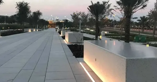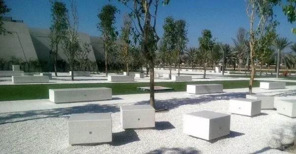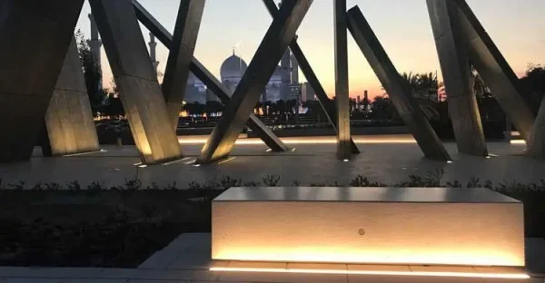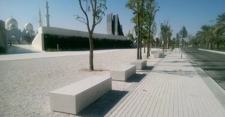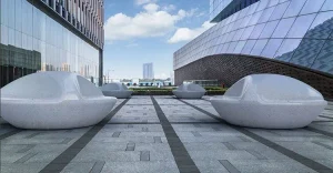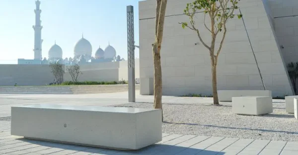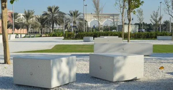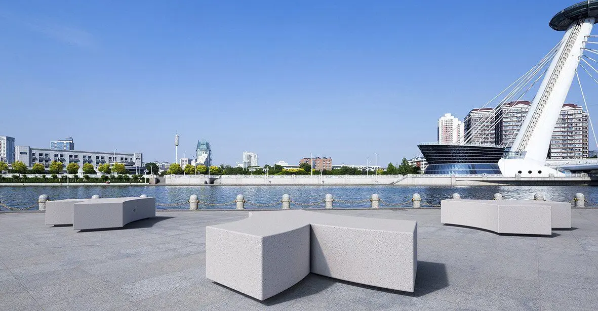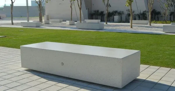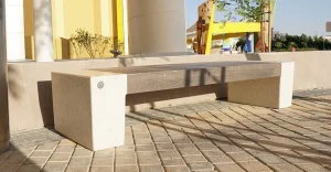 Modularna dvosmjerna klupa pravokutnog presjeka mod. “KUBB Y”, koji se sastoji od monolitne klupe opremljene tamnom bazom.