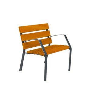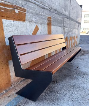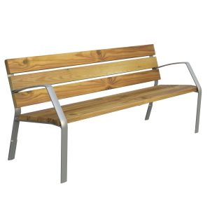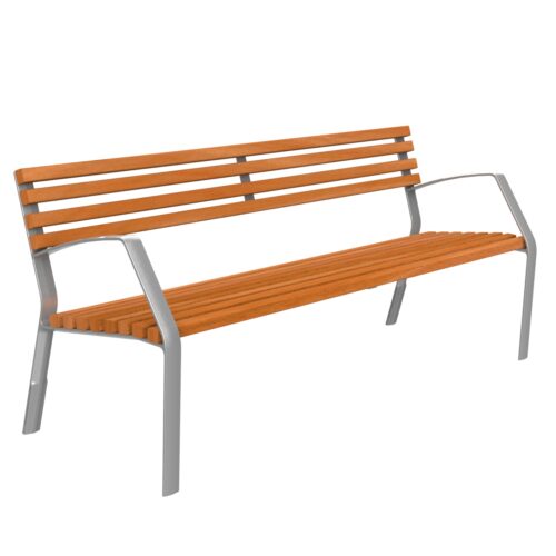 Vanjska klupa s nogama od eloksiranog aluminija (AG3) i 12 letvica od gvinejskog drva dimenzija 35x110x1800 mm, obrađenih lakom s otvorenim porama i vijcima od nehrđajućeg čelika.
