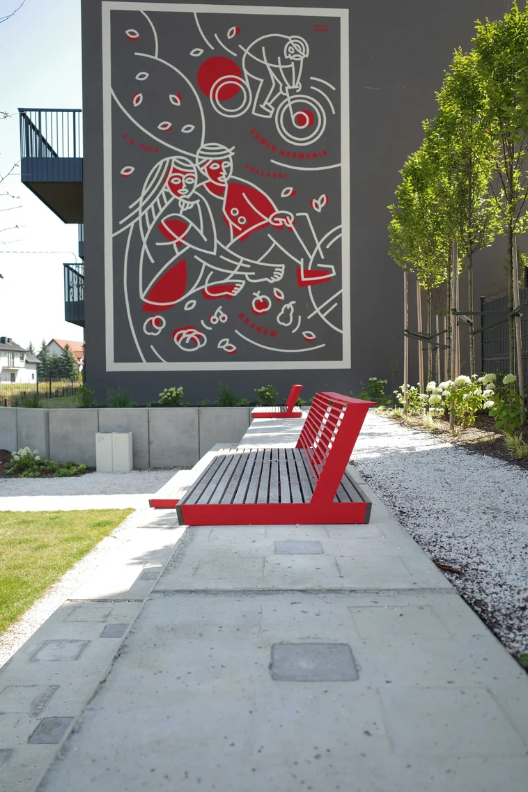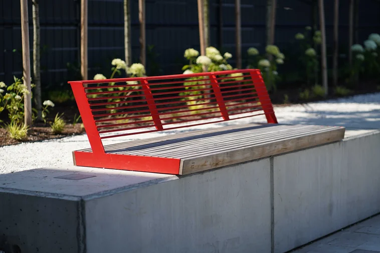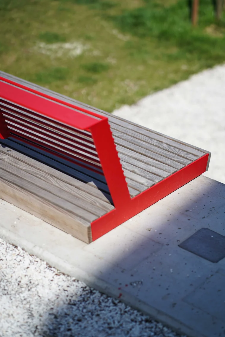 - Materijal: Konstrukcija se sastoji od čeličnog okvira sjedala s naslonom od čelične šipke. Drvene letvice sjedala pričvršćene su pričvršćivačima od nehrđajućeg čelika.