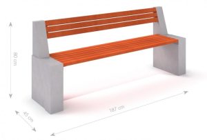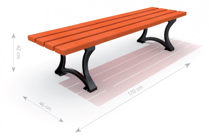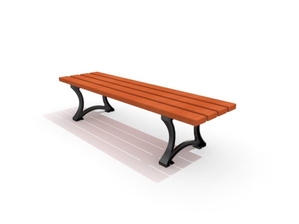 Klupa od lijevanog željeza bez naslona i naslona za ruke. Sjedalo izrađeno od drva. Klupa zadržava elegantan i estetski izgled urbanog namještaja zahvaljujući lučnim čeličnim oblicima u skladu s drvom.
