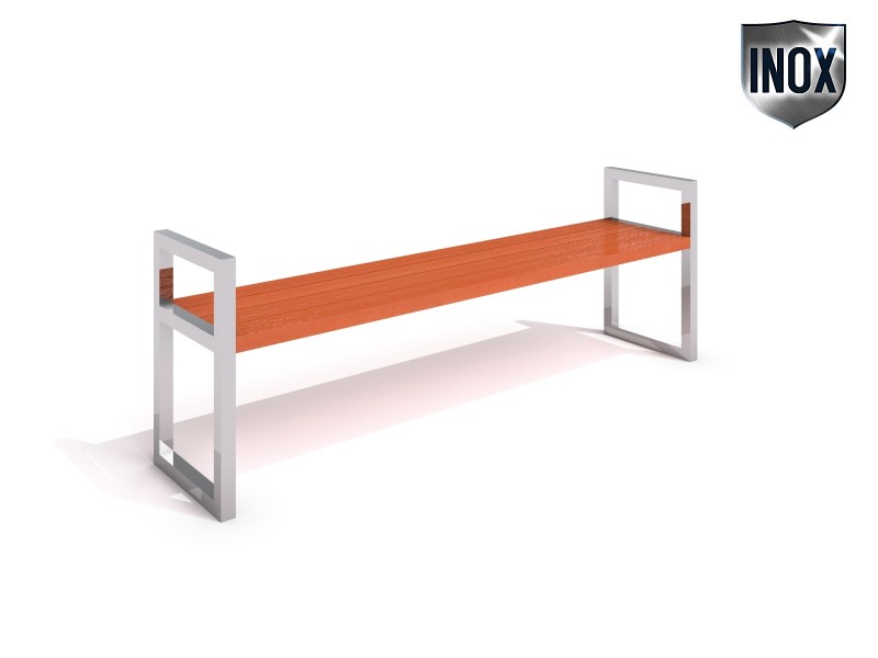Klupa od nehrđajućeg čelika s naslonima za ruke i bez naslona. Sjedalo i naslon izrađeni su od smrekovog drva, dostupni u bojama hrasta i palisandra. Klupa zadržava elegantan i jednostavan izgled urbanog namještaja.