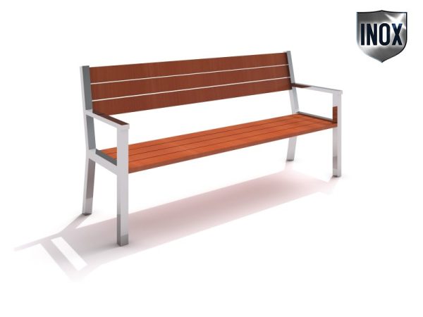 Klupa od nehrđajućeg čelika bez naslona za ruke i naslona. Sjedalo i naslon izrađeni su od smrekovog drva, dostupni u bojama hrasta i palisandra. Klupa zadržava elegantan i jednostavan izgled urbanog namještaja.