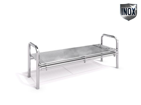 Klupa od nehrđajućeg čelika s naslonima za ruke i bez naslona. Sjedalo je izrađeno od nehrđajućeg čelika. Klupa zadržava elegantan i jednostavan izgled urbanog namještaja.