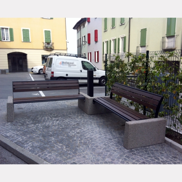 Klupa čelik-drvo sa stranicama od mramornog granulata. Sastoji se od dva bočna čelična ramena oblikovana laserskim rezanjem, pričvršćena vijcima na bočne stijenke. Bočni oslonci opremljeni su ugrađenim navojnim čahurama. Zaobljene strane su od mramornog granulata.