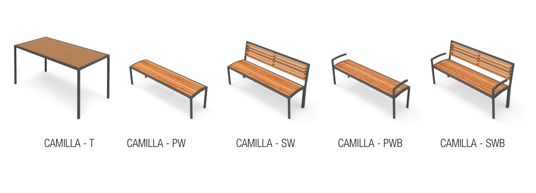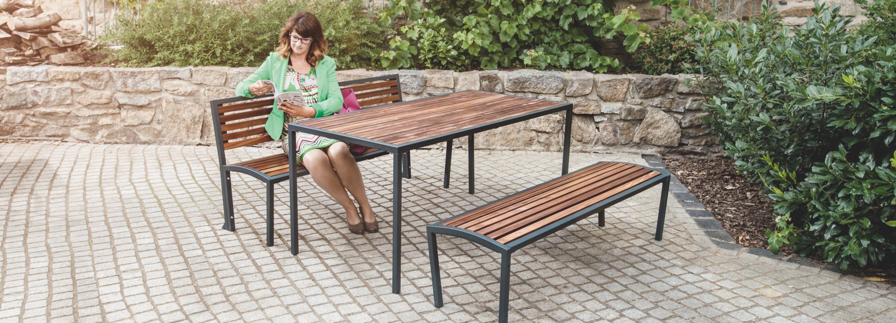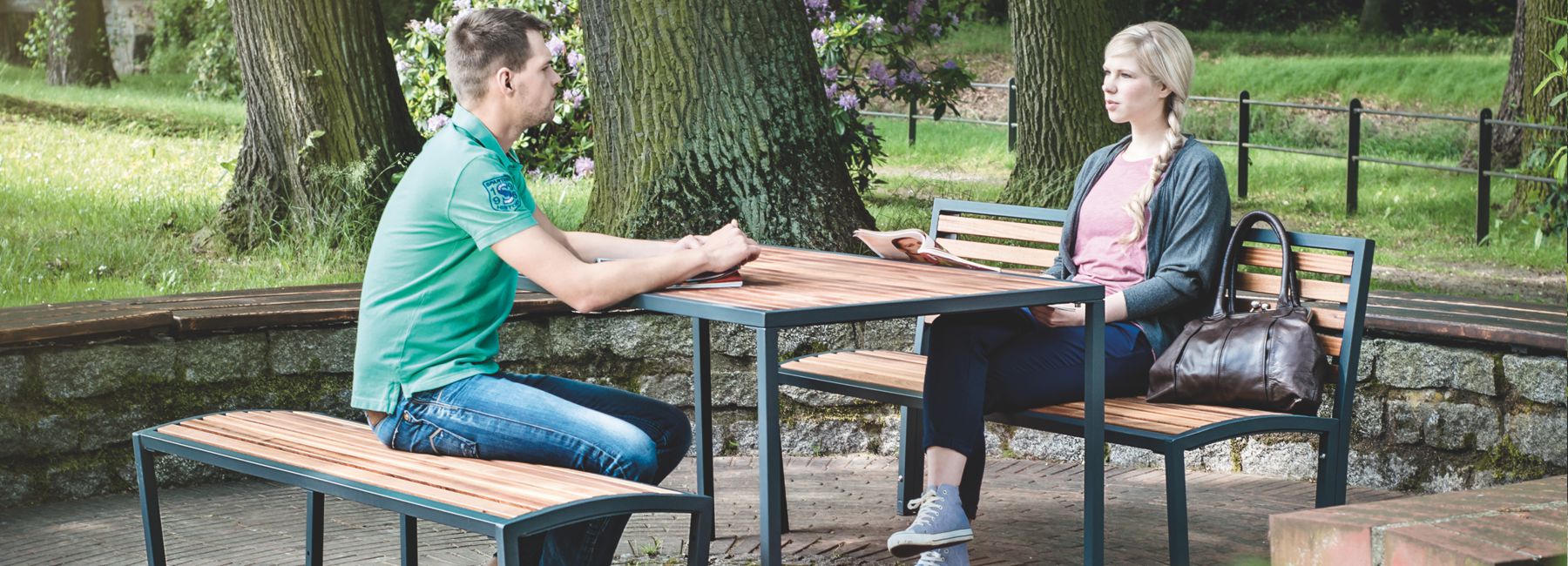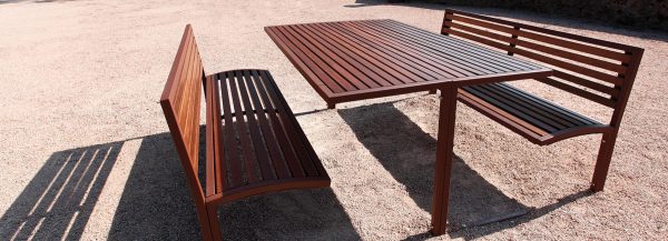 Stol s integriranim jednim ili dva sjedala s ogledalom i naslonom. Konstrukcija je izrađena od profilirane i zavarene čelične cijevi, sjedalo i ploča stola su od tvrdog drva ili letvica od termotretirane borovine.