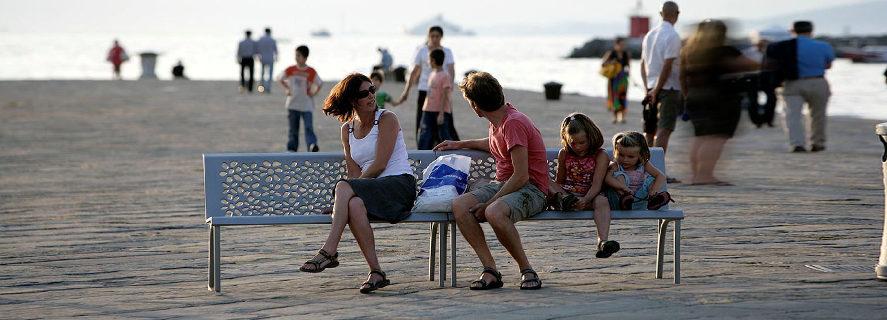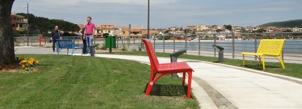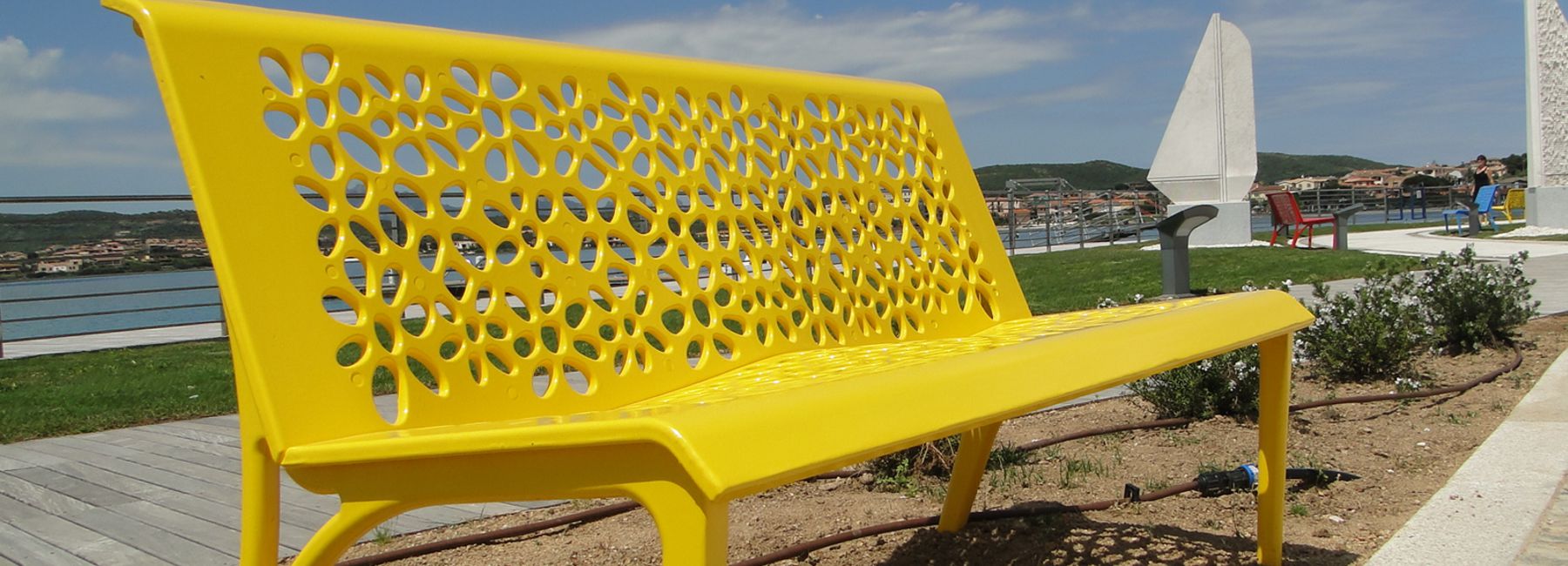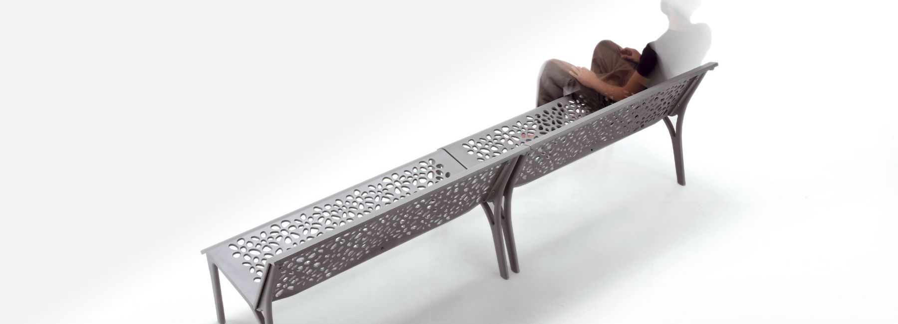 Klupa s naslonom ukrašenim cvijećem, u potpunosti od lijevanog aluminija sastavljena od dva bočna oslonca, meke i čiste linije.