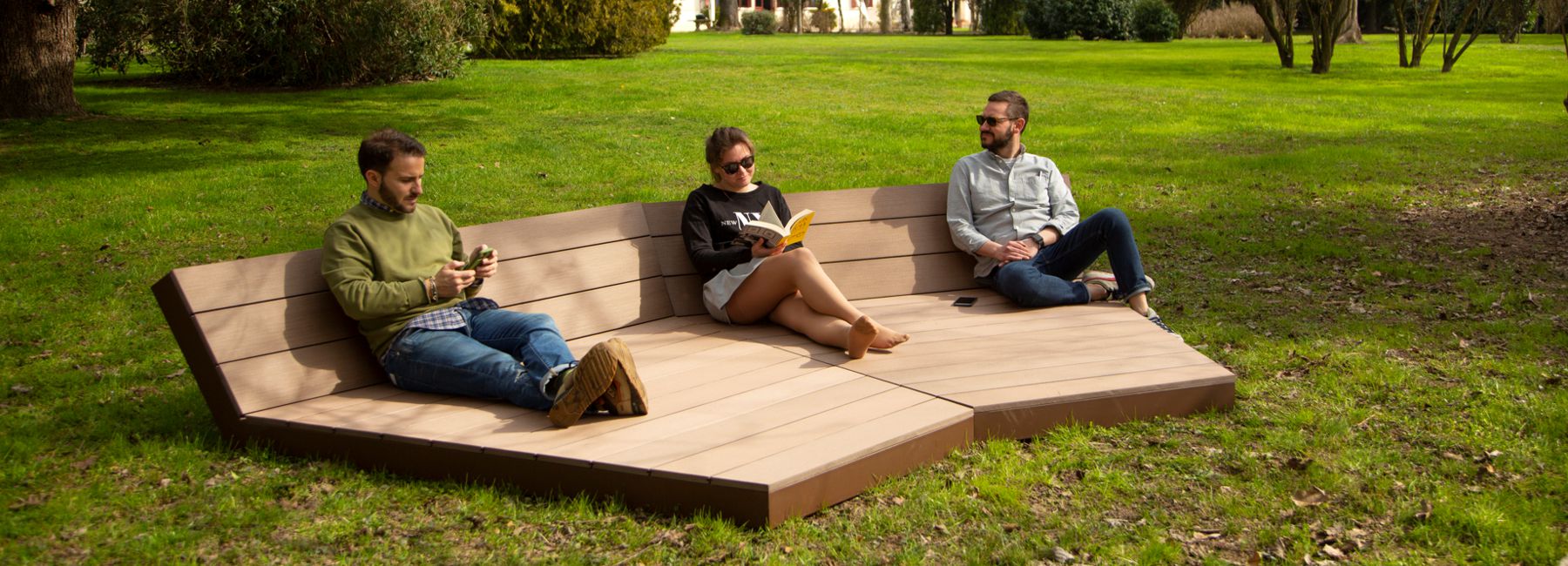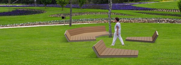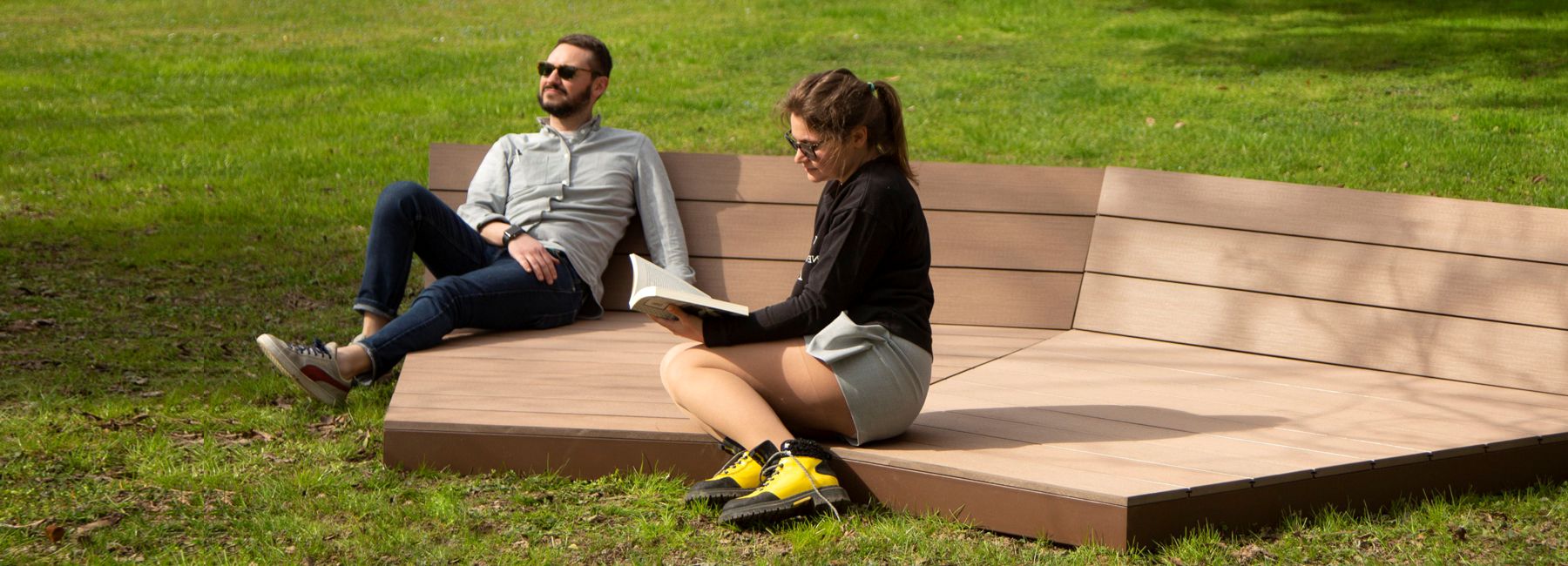 Modularno trapezoidno sjedalo s kosim naslonom, izrađeno od čeličnog cjevastog okvira na koji su fiksirane WPC letvice.