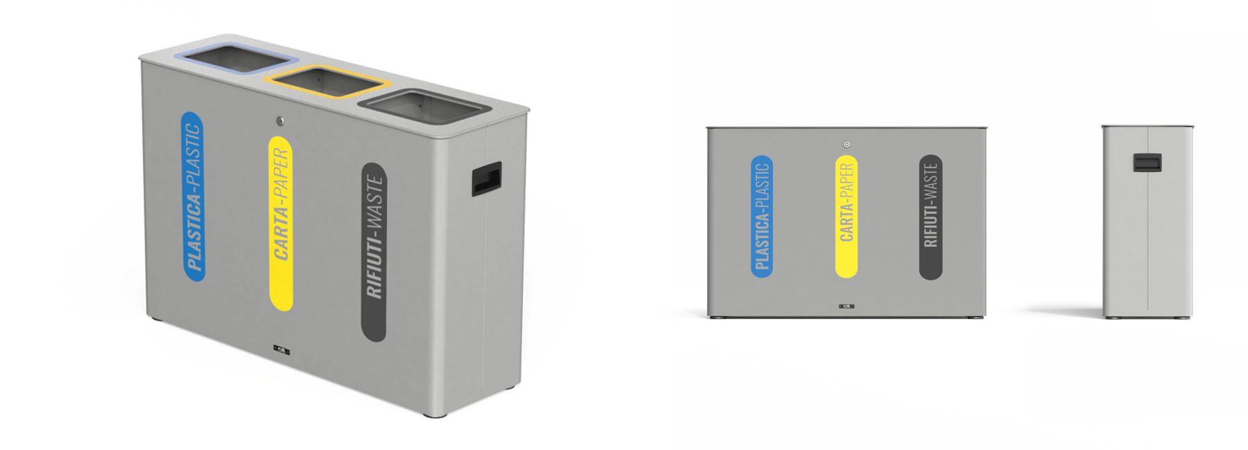 Kanta za razvrstavanje otpada sa zavarenom konstrukcijom od čeličnog lima na koju je pričvršćen poklopac s tri rupe u aluminijskom limu.