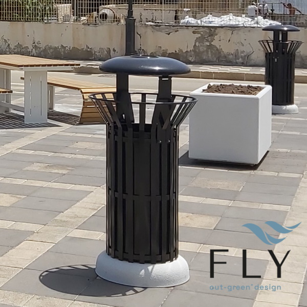 Eliptična posuda za otpatke izrađena od pocinčanog i lakiranog čelika, zajedno s prstenom za držač vrećica i pepeljarom na poklopcu. Isporučuje se s osnovnim pločama za pričvršćivanje na tlo pomoću ekspanzijskih vijaka.
