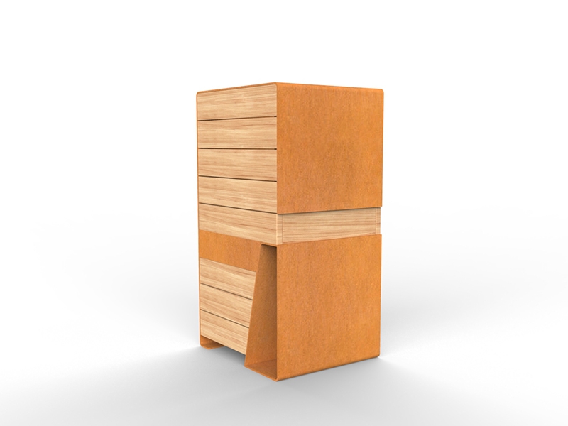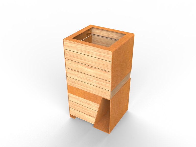 Ova jedinstvena gradska kanta za smeće skladna je kombinacija sirove elegancije corten čelika s toplinom prirodnog drva. Konstrukcija kante za smeće izrađena je od izdržljivog corten čelika, koji s vremenom prekriva karakterističnu hrđavu patinu, dajući joj jedinstven, industrijski izgled. Drveni elementi, izrađeni od visokokvalitetnog bora, johe ili egzotičnog sapeli drva, dodaju prirodni šarm i toplinu kanti za smeće.
