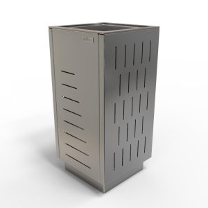 Kanta za otpatke KA.20.05.01 Inoplex poznata je po jednostavnoj čeličnoj konstrukciji, koja može biti izrađena od poliranog nehrđajućeg čelika AISI 304 ili crno pocinčanog čelika te praškasto lakirana u bilo koju boju iz osnovne RAL palete. Pepeljara u krovu uvijek je od nehrđajućeg čelika.