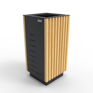 Ova jedinstvena gradska kanta za smeće kombinira moderan dizajn nehrđajućeg čelika ili čelika s praškastim premazom s toplinom prirodnog bora, johe ili egzotičnog sapeli drva. Krov štiti od kiše i snijega, a čvrsta čelična konstrukcija jamči trajnost. Drveni elementi dodaju eleganciju i prirodni šarm, savršeno nadopunjujući svaki urbani prostor.