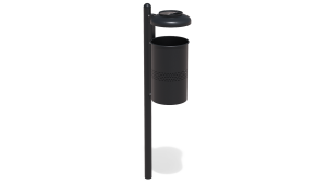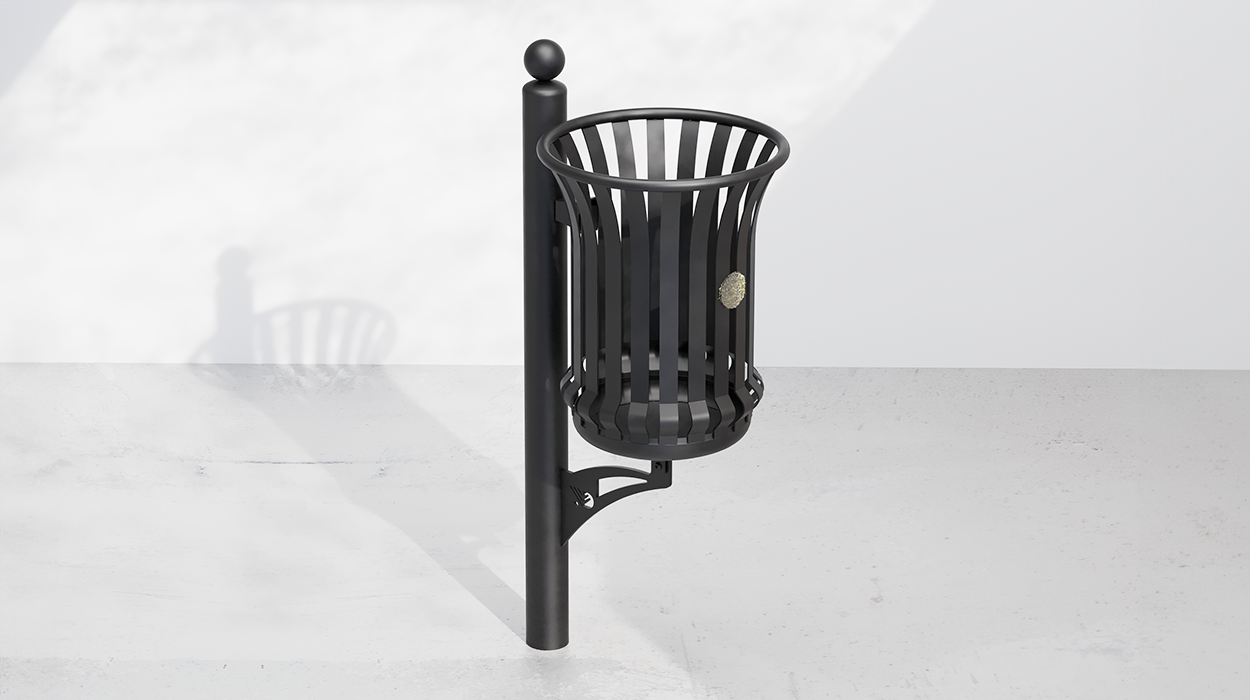Kanta za otpad sastoji se od uspravnog nosača u okrugloj pocinčanoj čeličnoj cijevi ukrašenoj na vrhu ukrasnim frizom i oblikovanog kraka za podupiranje košare od pocinčanog čeličnog lima. Cilindrična košara, proširena na vrhu, izrađena je od 20 oblikovanih pocinčanih željeznih traka; gornji dio obrubljen prstenom u okrugloj pocinčanoj cijevi; oblikovano dno od pocinčanog lima s rupama za odvod kišnice.