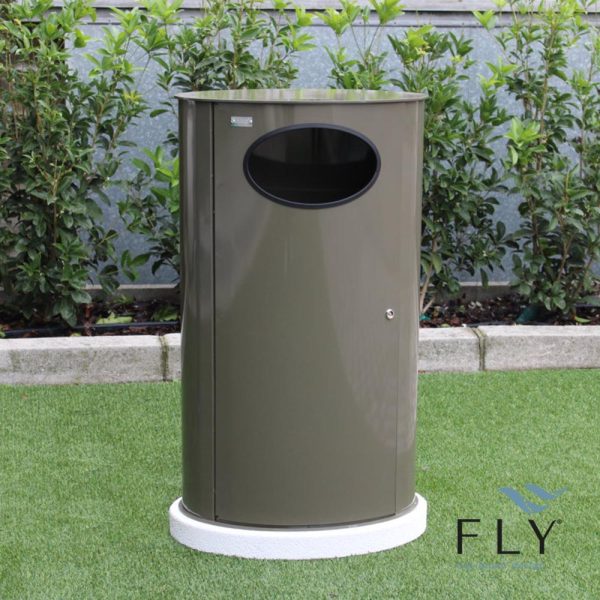 Elipsasti spremnik od pocinčanog i lakiranog čelika. U kompletu s prstenom za držač vrećice i poklopcem s pepeljarom. Sa betonskom podlogom