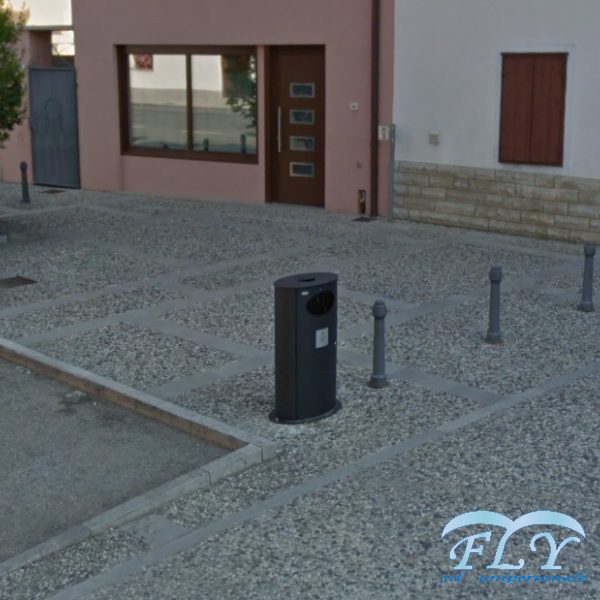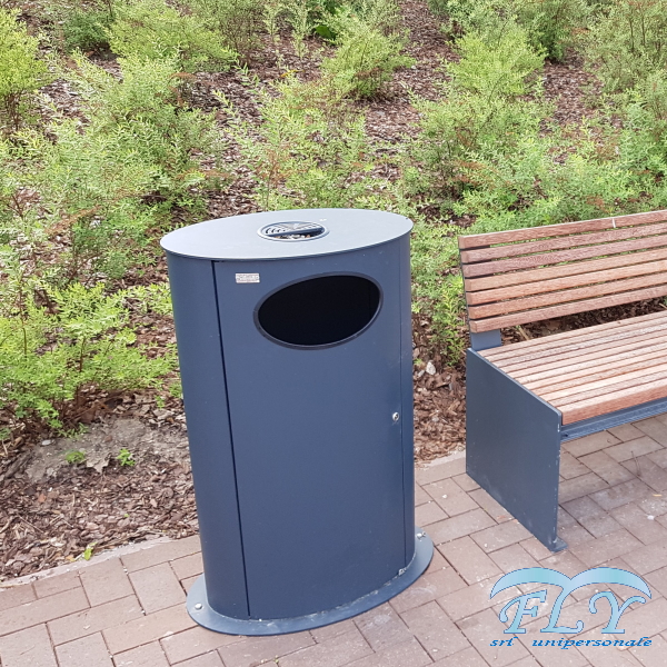 Eliptična posuda za otpad izrađena u cijelosti od metalnog lima i unutarnjeg okvira u ploči s dnom i gornjim poklopcem od čeličnog lima koji jamči stabilnost i nedeformabilnost. Gornji poklopac zavaren na tijelo spremnika je perforiran u sredini za umetanje pepeljare koja se može izvaditi i za njeno pražnjenje. Kanta za otpatke otvara se preko prednjih vrata u čijem se gornjem dijelu nalazi otvor za unošenje otpada. Vrata su opremljena bravom sa univerzalnim ključem. Vreća za otpad pričvršćena je na poseban prsten za držanje vrećice od nehrđajućeg čelika duž cijelog unutarnjeg oboda spremnika. Svi metalni dijelovi su pocinčani i obojeni termoreaktivnim poliesterskim prahom, vijci su od nehrđajućeg čelika. Isporučuje se s eliptičnom bazom opremljenom s 3 rupe za pričvršćivanje na tlo pomoću ekspanzijskih vijaka.