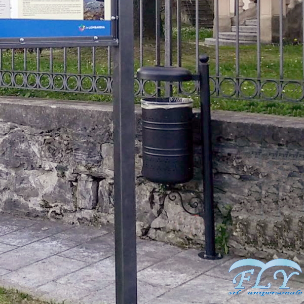 Kanta za smeće izrađena od pocinčanog i lakiranog čelika, s cilindričnim spremnikom i stupom s baznom pločom za pričvršćivanje na tlo vijcima. U kompletu s prstenom za držač vrećice i poklopcem s pepeljarom.