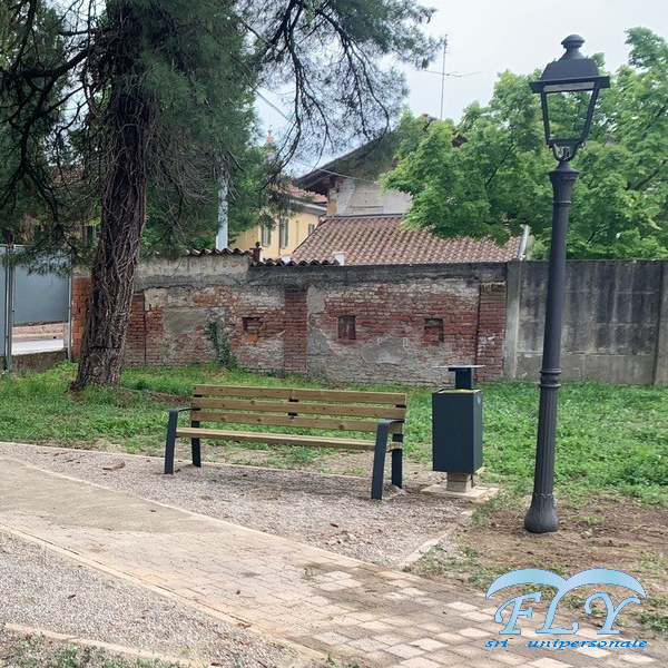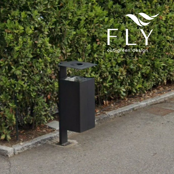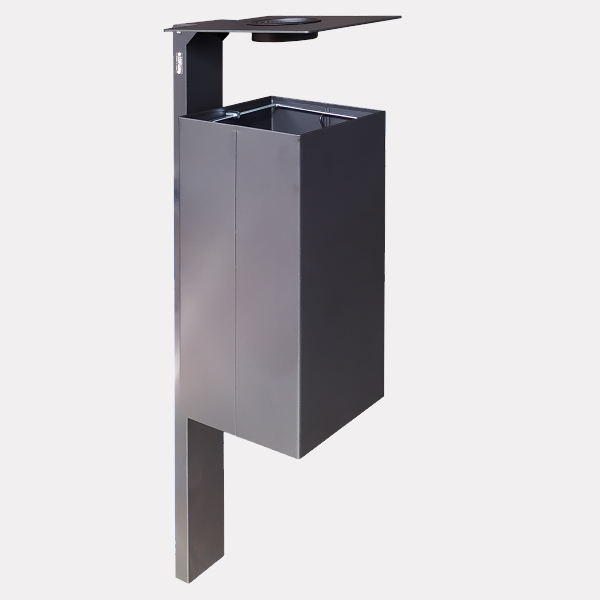 Sosia kanta za otpad s četvrtastim stupom koja se pričvršćuje vijcima. Kanta za otpatke s kvadratnom posudom. Donji dio je zatvoren i perforiran u sredini kako bi se olakšala odvodnja kišnice ili povremeno čišćenje. Spremnik se isporučuje s prstenom za držanje vrećice i pričvršćen je vijcima na pravokutni čelični cjevasti nosač koji se isporučuje s baznom pločom za pričvršćivanje na tlo vijcima (nije isporučeno). Laserski rezan poklopac od lima, zajedno s pepeljarom, pričvršćen je na gornji kraj cjevaste ploče. Poklopac se može podići i spustiti kako bi se izvadila vrećica. Svi metalni dijelovi su pocinčani i obojeni termoreaktivnim poliesterskim prahom. Vijci su od nehrđajućeg čelika.