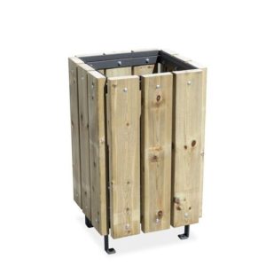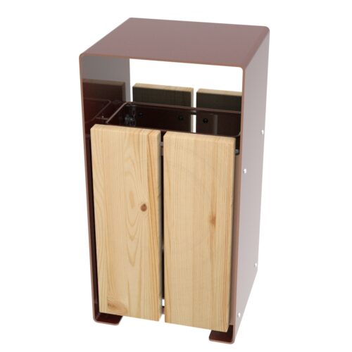 Koš za smeće model Tauló s nosačima od čelika obojenog cortenom i 4 trake od FSC® certificiranog crnogoričnog drva.