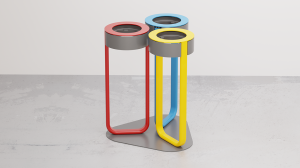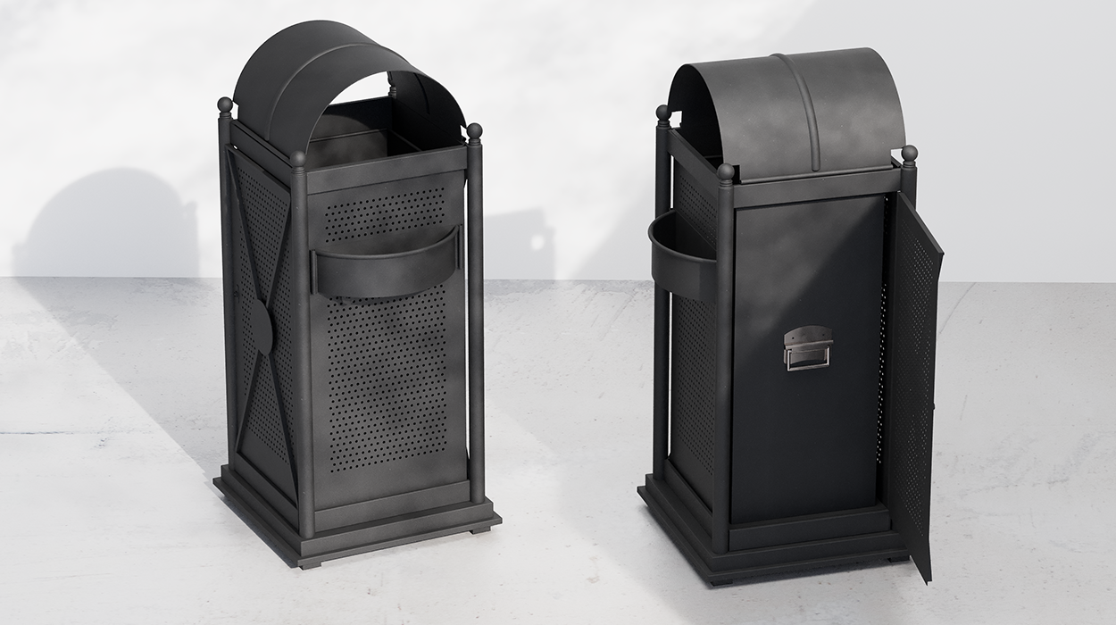 Karakterizira ga kvadratni oblik; sastoji se od četiri stupa od okrugle pocinčane čelične cijevi s ukrasnim elementom na vrhu. Stupovi su međusobno povezani prečkama, smještenim na vrhu i dnu, od pravokutne pocinčane čelične cijevi; bočne stijenke od pocinčanog lima, s naizmjeničnim kružnim otvorima; stijenke su izvana zaštićene, s dvije suprotne strane, pocinčanim kvadratnim prečkama. Kanta za smeće opremljena je s dvije bočne pepeljare od pocinčanog lima, s rubovima otpornim na rezanje. Oblikovani, fiksni poklopac, od pocinčanog lima, sa središnjim rebrom za učvršćivanje i rubovima otpornim na rezanje. Unutarnja posuda, od pocinčanog lima s rubovima otpornim na rezanje na vrhu; opremljena dnom s otvorima za odvod kišnice i ručkama za jednostavno hvatanje i uklanjanje. Baza od pocinčanog čeličnog profila u obliku slova “L”; baza je opremljena s 4 nožice koje sprječavaju izravan kontakt konstrukcije s tlom.
