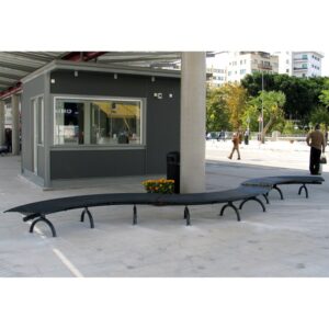 Klupa se sastoji od pocinčane čelične konstrukcije obojene termoreaktivnim poliesterskim prahom. Sastoji se od 4 oblikovana potporna ramena od čeličnog lima koja su međusobno povezana čvrstom vodoravnom poprečnom šipkom u kalandriranoj cijevi (da formiraju kut od 90°) i sjedištem od 22 izvučene cijevi, također kalandrirane. Križnica i iscrtani dijelovi su na krajevima zatvoreni PVC čepovima. Tri cjevasta nosača u obliku luka pričvršćena su na vodoravnu šipku vijcima i mogu se isporučiti s kompletom potpore ili pričvršćivanjem za tlo. Svi vijci su od nehrđajućeg čelika.