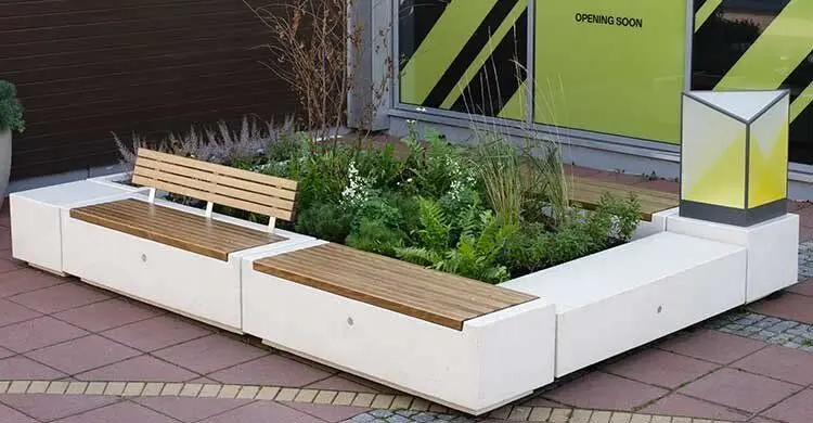 Linearna modularna klupa, model DEMETRA M jednostruka, sastoji se od monolitnog sjedala poduprtog bazom opremljenom sustavom niveliranja. Klupa se po želji može opremiti s jednom ili dvije uzdužno postavljene LED svjetleće trake na dužoj strani, zajedno s pripadajućim napajanjem prema zahtjevu.