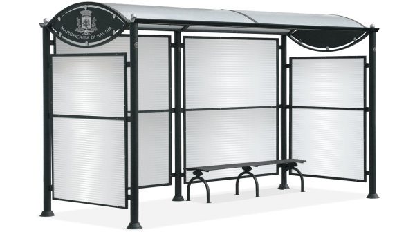 Sastoji se od 5 vertikalnih uspravnih elemenata od okruglih pocinčanih čeličnih cijevi, s prirubnicom u podnožju. Svaki pojedinačni uspravni element u gornjem dijelu je prekriven dekorativnim frizom. Stražnji i bočni zidovi izrađeni su od perimetralnog okvira od pocinčanog čeličnog kutnog profila, a ispune od prozirnog saćastog polikarbonata poduprte su profilima od pravokutne pocinčane čelične cijevi. Pokrov karakteriziran duguljastim bočnim oblicima, namijenjen za pričvršćivanje bilo koje grafike i/ili teksta, izrađen od pocinčanog lima i poduprt posebnim stezaljkama pričvršćenim na suprotne lukove od pravokutne pocinčane čelične cijevi. Okvir pokrova izrađen je od pocinčanog limenog profila i lukovi od pravokutne pocinčane čelične cijevi.