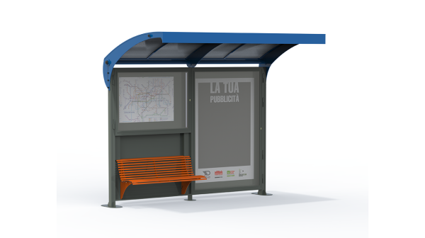 Sastavljena od 2 bočna vertikalna stupa, izrađena od oblikovanih profila od pocinčanog čelika; svaki pojedinačni stup karakterizira zaobljeni vanjski kut, a u podnožju je dovršen oblikovanom pločom i ukrućujućim nosačima, izrađenim od pocinčanog lima i dobivenim rezanjem laserom. Središnji stup izrađen je od pravokutne pocinčane čelične cijevi, s osnovnom pločom od pocinčanog lima. Okvir pokrova izrađen je od 3 oblikovana luka, izrađenih od pocinčanog lima i dobivenih rezanjem laserom; lukovi su međusobno povezani i integrirani pomoću 2 okrugle pocinčane čelične cijevi s plastičnim završnim kapama sa kuglastim glavama. Pokrov karakterizira okvir izrađen od pravokutne pocinčane čelične cijevi za podupiranje gornjeg ispuna, izrađen od neprozirnog saćastog polikarbonata. Prednji pojas krova, uklonjiv, izrađen od prešano savijenog profila od pocinčanog lima, dizajniran za moguću primjenu naljepnica s nazivom stajališta.